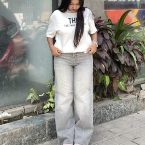 5-pocket jeans in Grey washed cotton denim. High waist, zip fly and button and straight, wide legs.